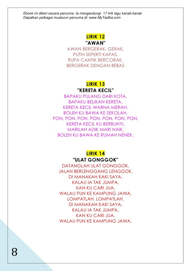 Dengan meminta kanak-kanak menghafal sesuatu lirik lagu kanak-kanak ini secara tidak langsung akan membuat mereka membaca dengan penuh teliti. MP3 Lagu Kanak-kanak Islam. Bergerak Dengan Bebas Lirik 13 Kereta Kecil Bapaku Pulang Dari Kota Bapaku Belikan Kereta Kereta Kecil Warna Merah Boleh Ku Bawa Ke Sekolah Pon Pon Pon Pon Pon Pon Pon Kereta Kecil Ku Berbunyi Marilah Adik Mari Naik Boleh Ku Bawa Ke Rumah Nenek.