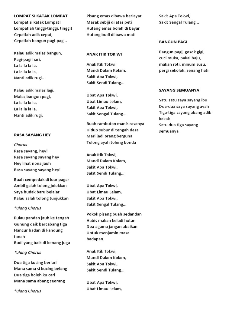 Mari kita ambil payung. Pilihlah lagu yang mengandungi banyak ulanagan lirik dan melodi yang mudah dipelajari. IKAN KEKEK MAK ILOI ILOI IKAN GELAMA MAK ILAI ILAI KALAU ADIK NAK JADI PANDAI.